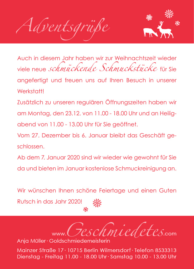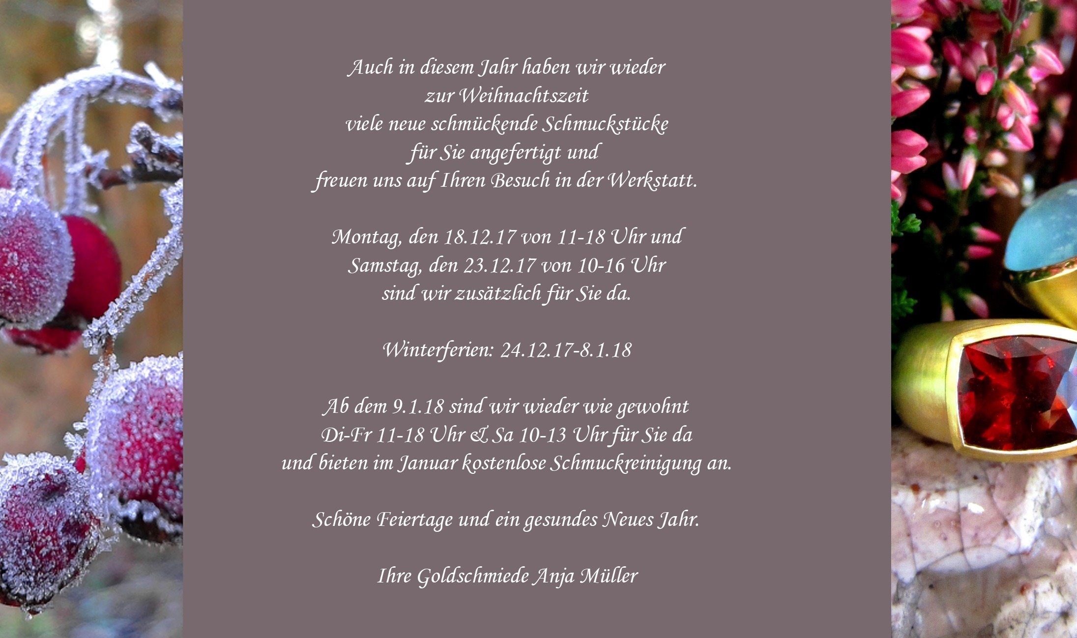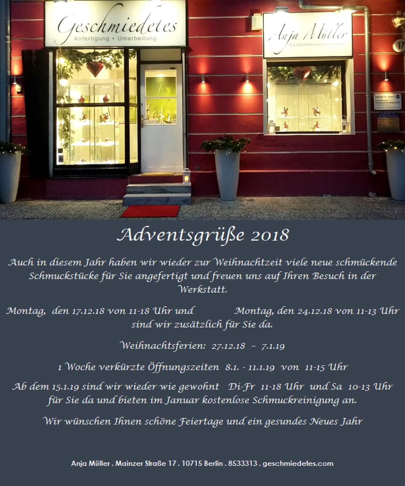 Am Montag den 15.12.2014 und Montag den 22.12.2014 ist die Goldschmiede von 11.00-18.00 Uhr zusätzlich für Sie geöffnet.