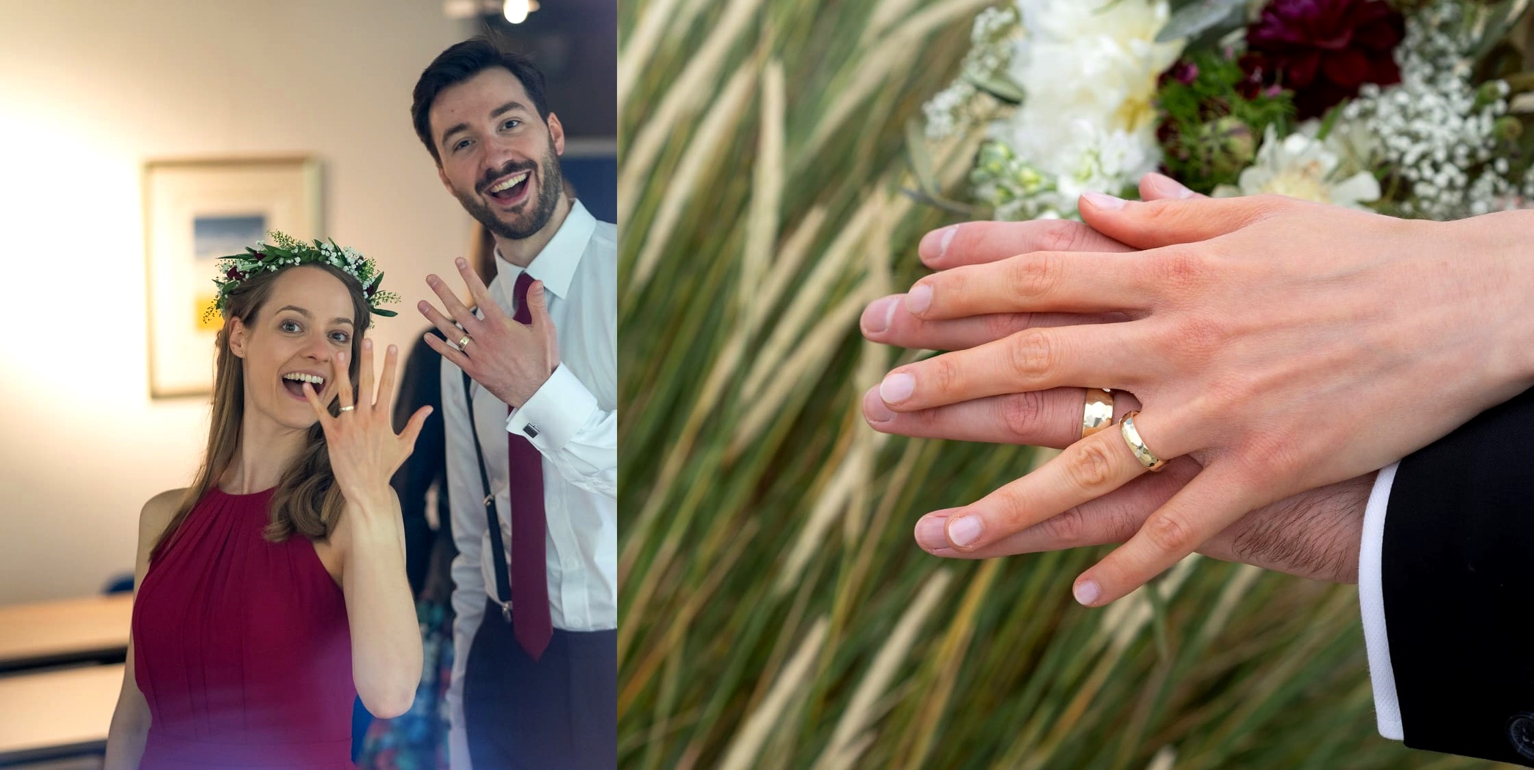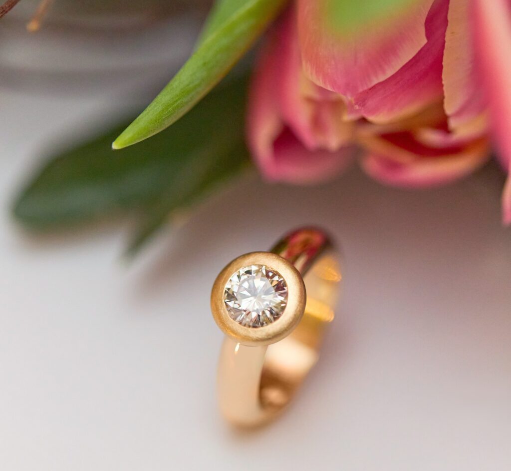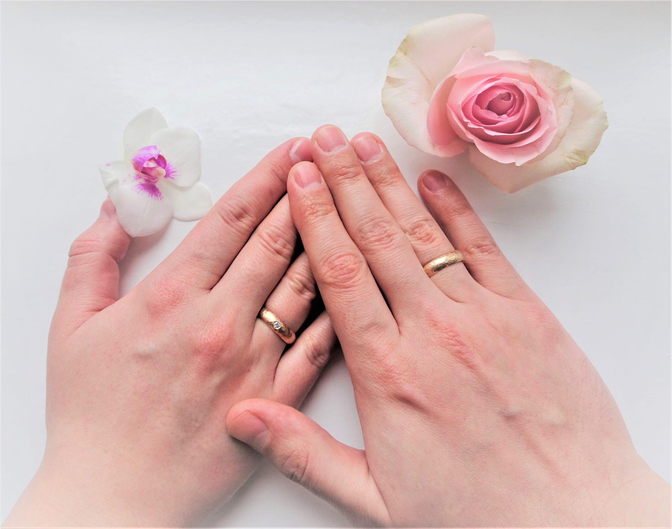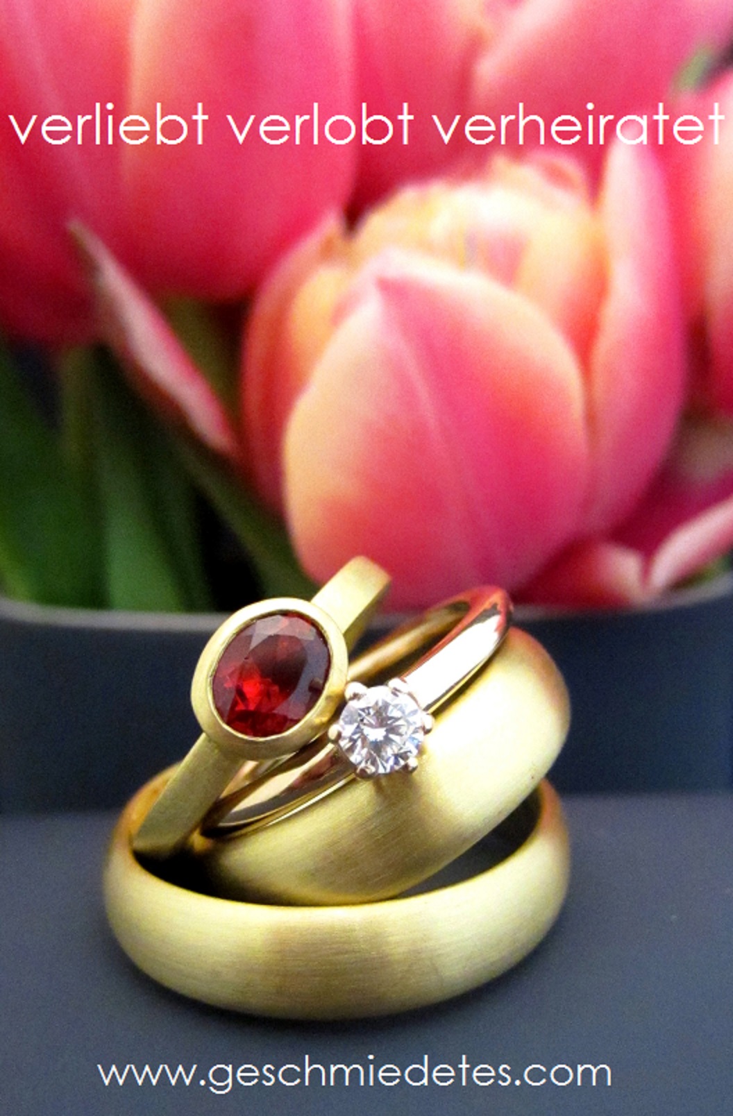 Gelbgold Trauringe mit Hammerschlag und einem Brillanten im Damenring.